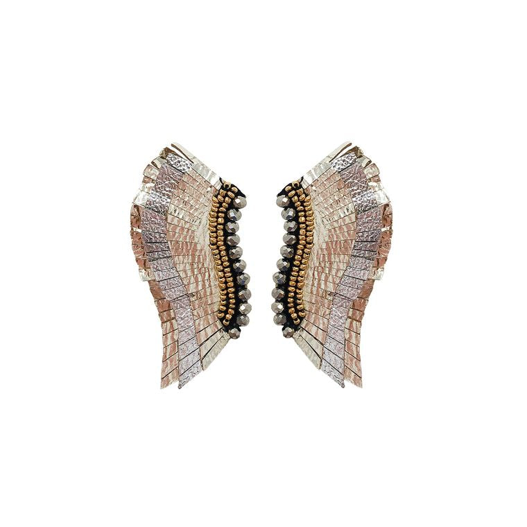 Channel your inner goddess! Three layers of fringed gold and silver metallic leather wings are accented with gold seed beads and geometric gunmetal beads.