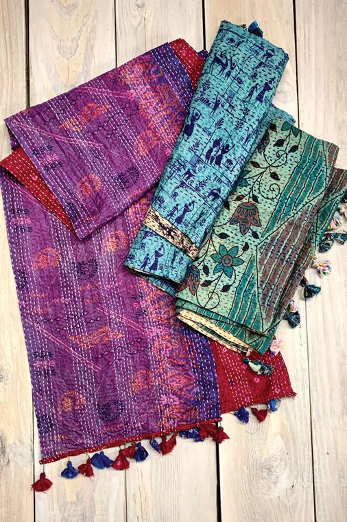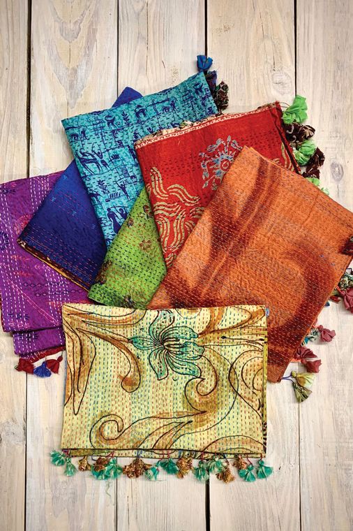 Sevya's Kantha Recycled Silk Sari Scarf is handmade by women artisans in India using 100% silk recycled saris. The scarves are hand-embroidered and have handmade tassels, with different prints and colors on each side. Each piece is unique and truly a work of art. Comes in assorted colors and prints.