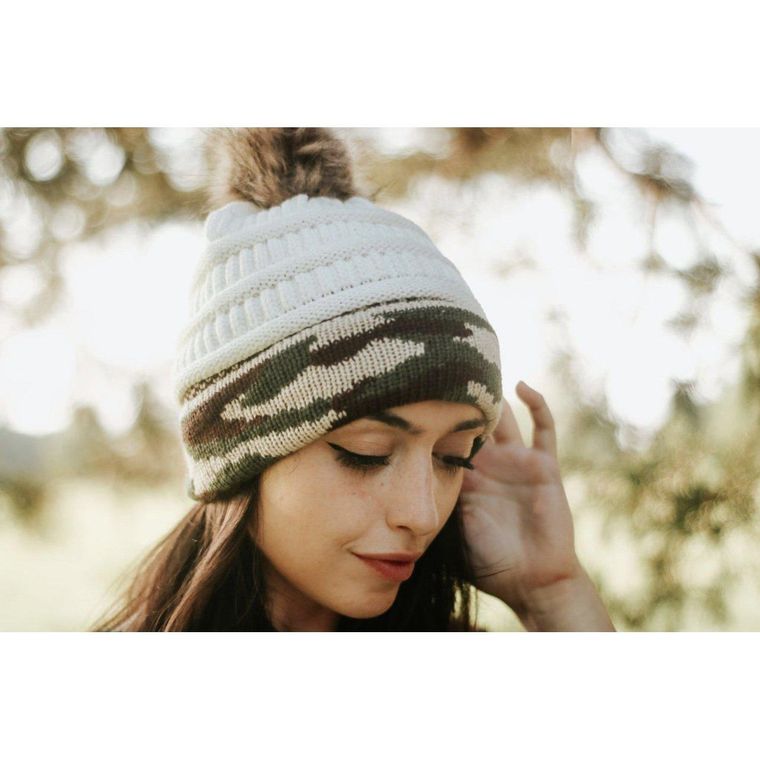 Ivory and Camo Knitted Hat Beanie with Fur Pom