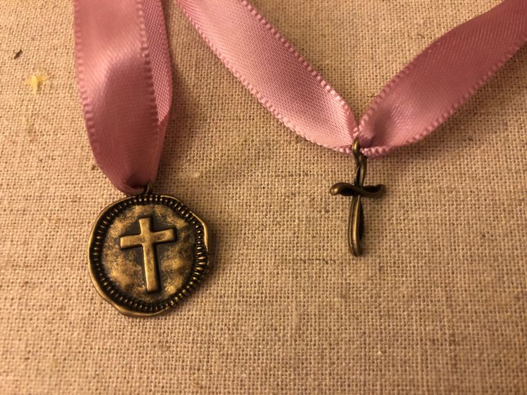 This beautiful image of the Madonna wrapped in wax paper and tied with a ribbon and a one small cross charm.