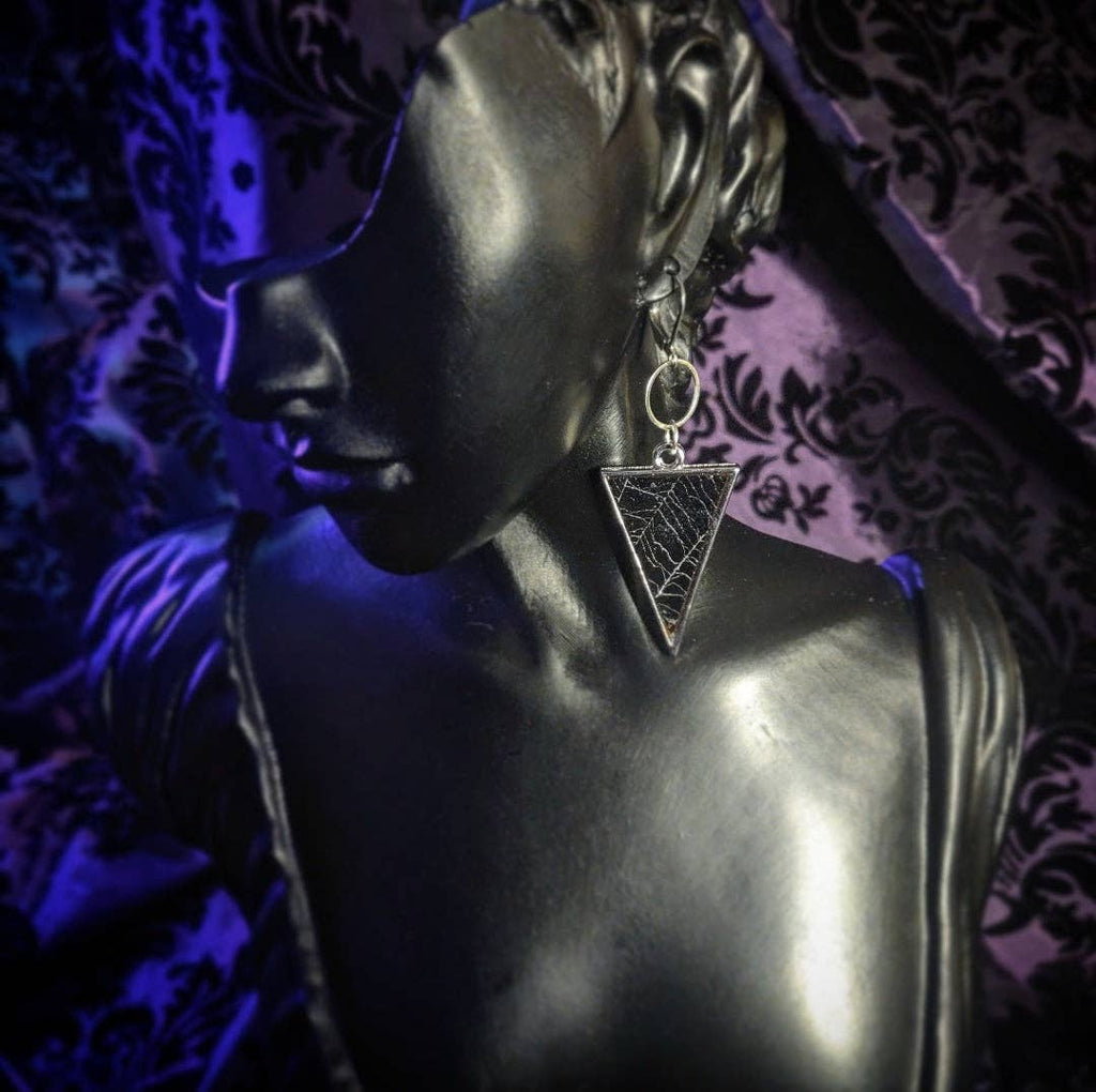 Responsibly sourced spider web set into stylish long triangle bezels. Each set is hand cast by Holly Macabre and has a fun green, purple colors gift backing. Material: Zinc alloy metal Appx length is just shy of three inches with a lever back clasp perfect for gauges or a night out on the town.